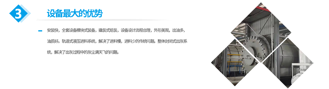 公司生產(chǎn)的設(shè)備的優(yōu)勢(shì):安裝快,全套設(shè)備模塊式裝備,撬裝式組裝,設(shè)備設(shè)計(jì)流程合理,外形美觀,出油多,油質(zhì)好。軌道式液壓進(jìn)料系統(tǒng),解決了進(jìn)料慢,進(jìn)料少的傳統(tǒng)問(wèn)題。整體封閉式出灰系統(tǒng),解決了出灰過(guò)程中的灰塵滿天飛的問(wèn)題。